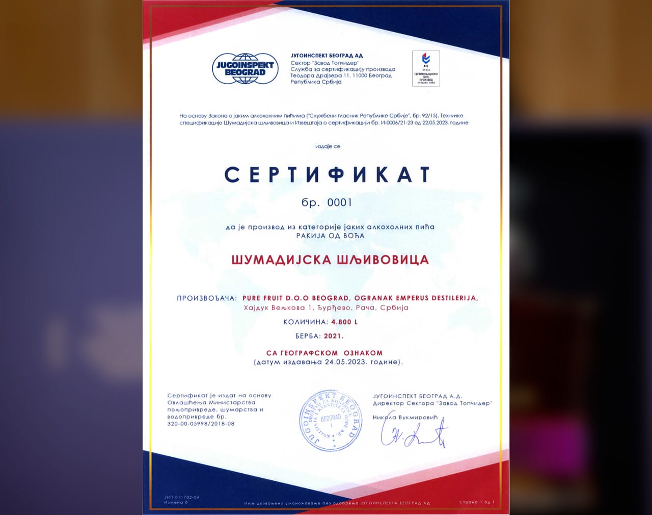 EMPERUS Šumadija Slivovitz is the fulfillment of our mission: to share the story of Serbian brandy worldwide, placing it alongside the world’s most celebrated spirits. Achieving this mission would be impossible without certification that attests to our origins and the source of our heritage.